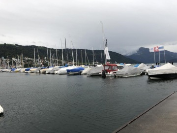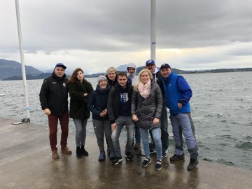 Youth hostel, kde jsme ubytovaní, dělí od Bossard arény jen silnice. A tak po vybalení a malém občerstvení vyrážíme v dešti na obhlídku okolí. V přístavu obdivujeme řadu krásných malých i větších lodí, potkáváme i několik rybářů. . Kolemjdoucího pána poprosíme, zda by nám udělal společnou fotografii. Nakonec se ukáže, že je to také fanoušek, který přijel za hokejisty do Zugu. A tak se dáváme do řeči. Svět je zkrátka malý. Pak vyrážíme na prohlídku Bossard arény. Nejprve se kocháme v místním fantastickém fanshopu. Nejvíce naší pozornosti patří dresu Honzi Kováře – patriotismus je patriotismus. Hala je překrásná a i když 9 let stará, stále září novotou. Právě v ní probíhá dětský trénink, který z hlediště sleduje nějaký pán s dítětem v náručí. Když slyší češtinu, dá se s námi do řeči. Je to Zlíňák pracující a žijící v Zugu. Prozkoumali jsme útroby haly, pořídili spoustu fotek a vydáváme se do Starého města. Dloubeme se v nose ... :-D Obdivujeme místní památky i všudypřítomnou zeleň. Najdete ji na střechách i terasách domů. Naší pozornosti neuniknou ani místní obchody. Za zmínku stojí zejména ten s vozy Ferrari nebo s elektrokoly. Jednou z malebných uliček se dostáváme zpět do přístavu, kde si můžeme vychutnat překrásný západ slunce, kterému déšť přidává zvláštní atmosféru. Opět uděláme pár fotek, ale je nejvyšší čas si obléci dresy a šály…..